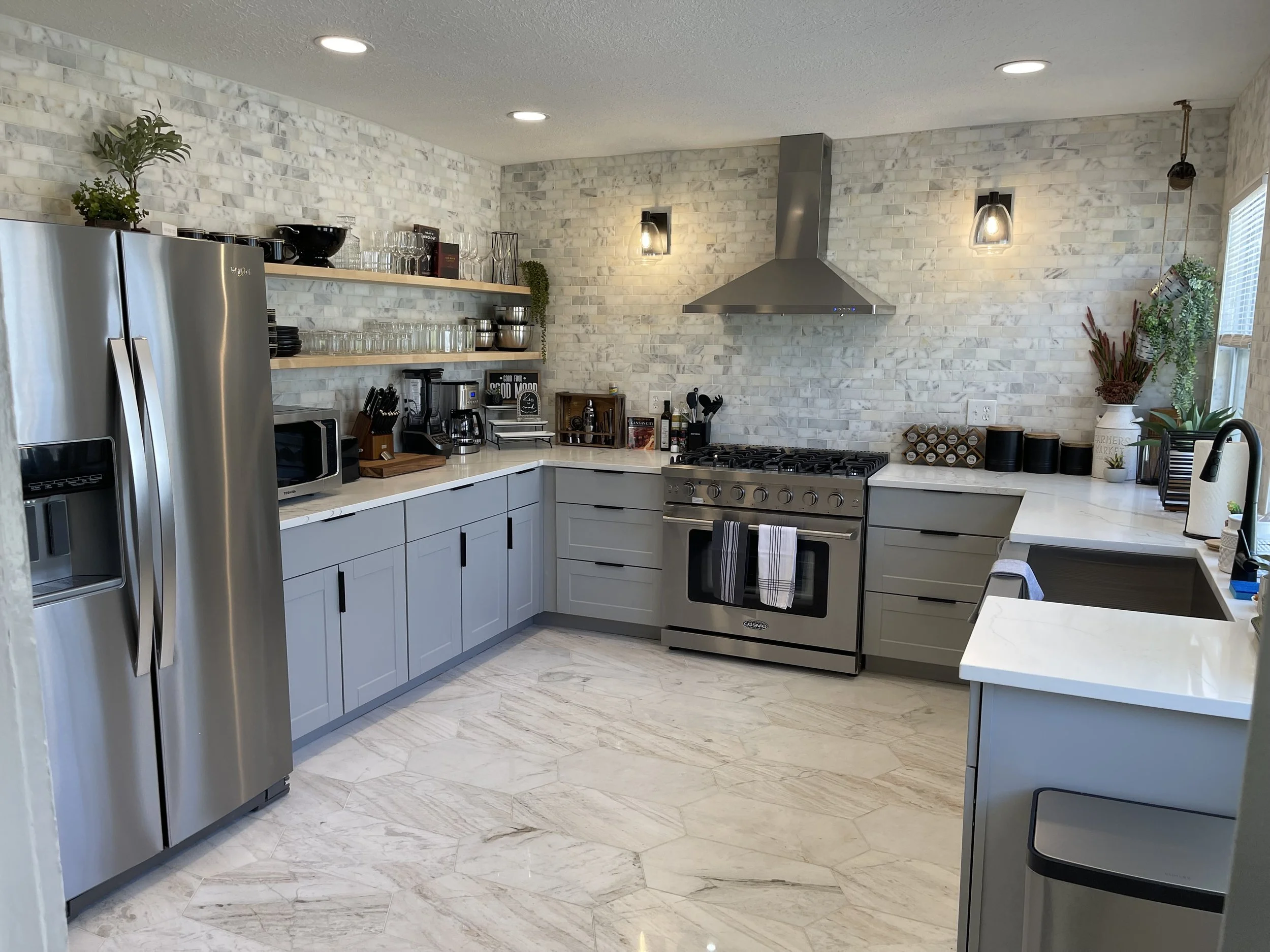 A full-scale home transformation, this remodel reimagined every corner of the space. It had good bones, it just needed a little polish! With the installation of rich new tile flooring and tile accent walls, this kitchen was transformed. Every finish, from colors and hardware to lighting, was thoughtfully selected to create a cohesive, elevated design. This project reflects the energy, precision, and pride we bring to every detail.