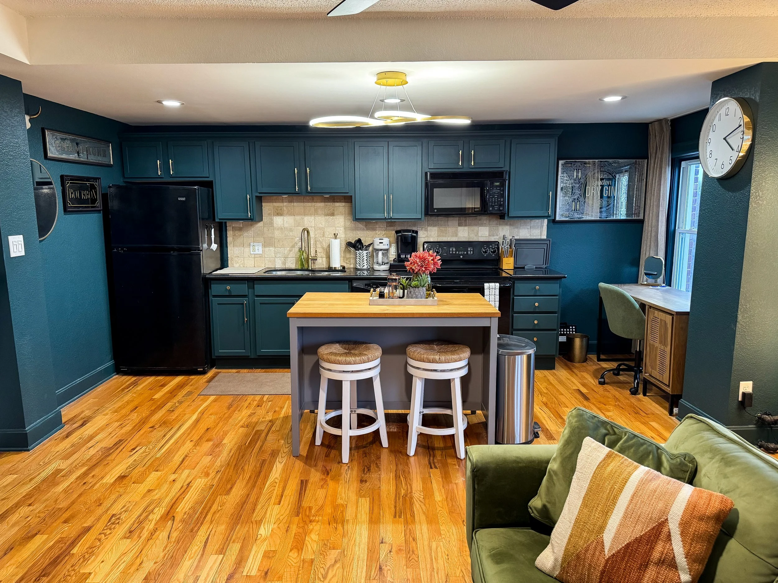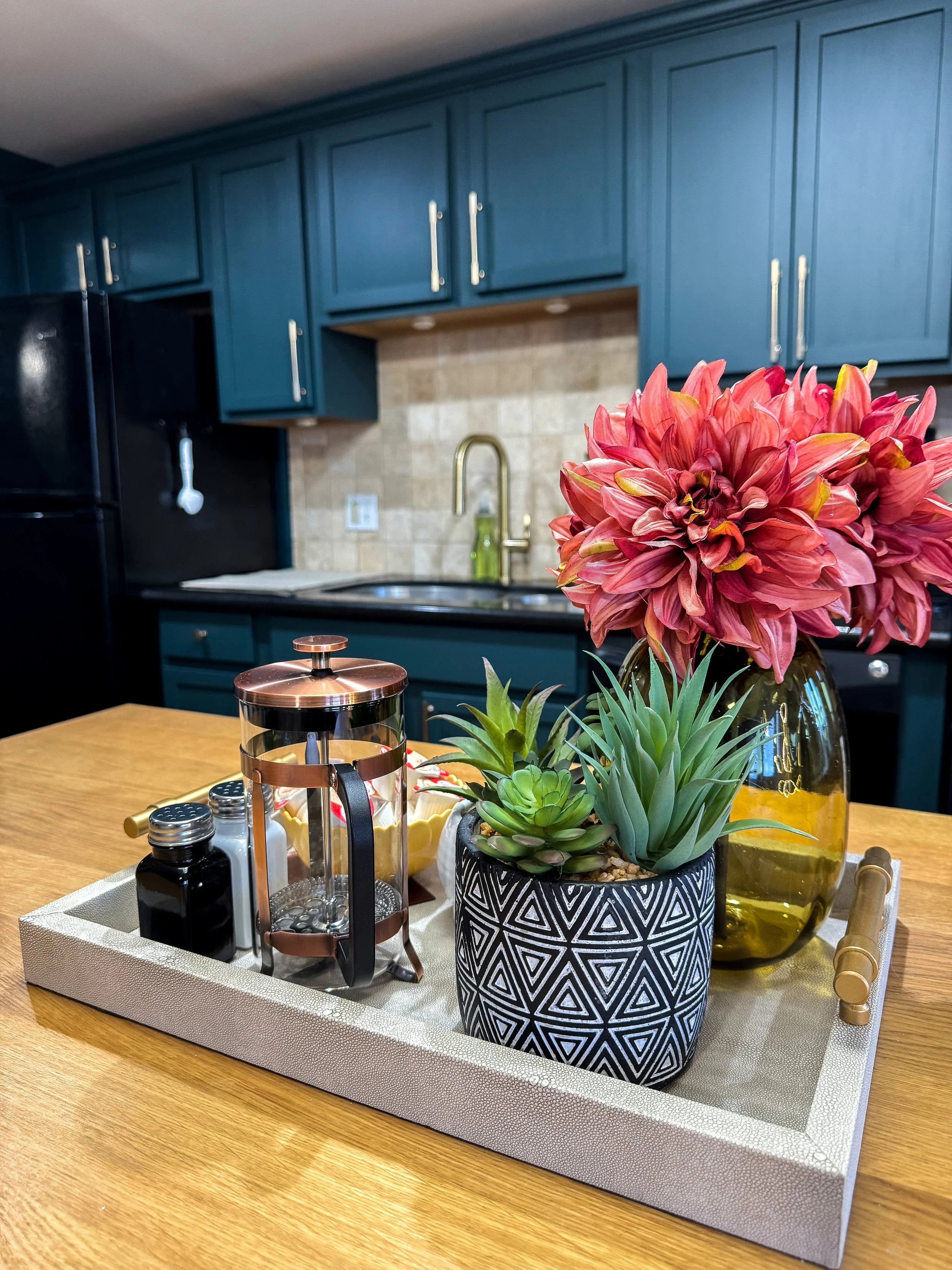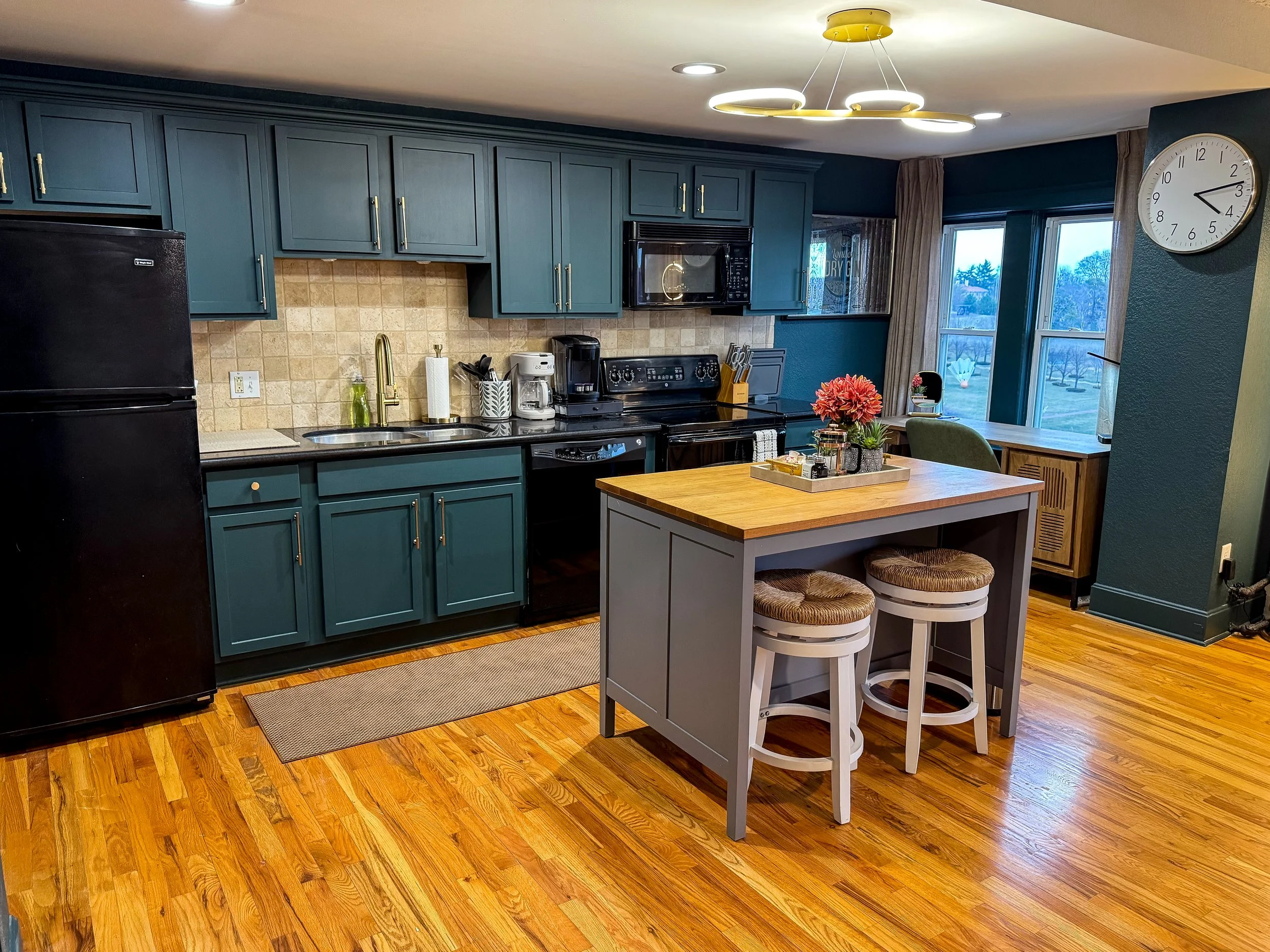 While this was more of a “face-lift” project, the end result is undeniably bold and unique. The dark, moody paint replaced the outdated and worn original cabinetry, allowing this space to feel modern and more visually striking. Pairing that with the updated cabinet pulls and gold faucet really elevated this space from its original state.